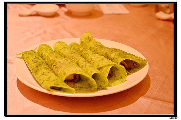片皮鴨,麵皮很有特色,加入了三星蔥一起和的麵皮,這邊用的沾醬有加入蘋果的特製沾醬,